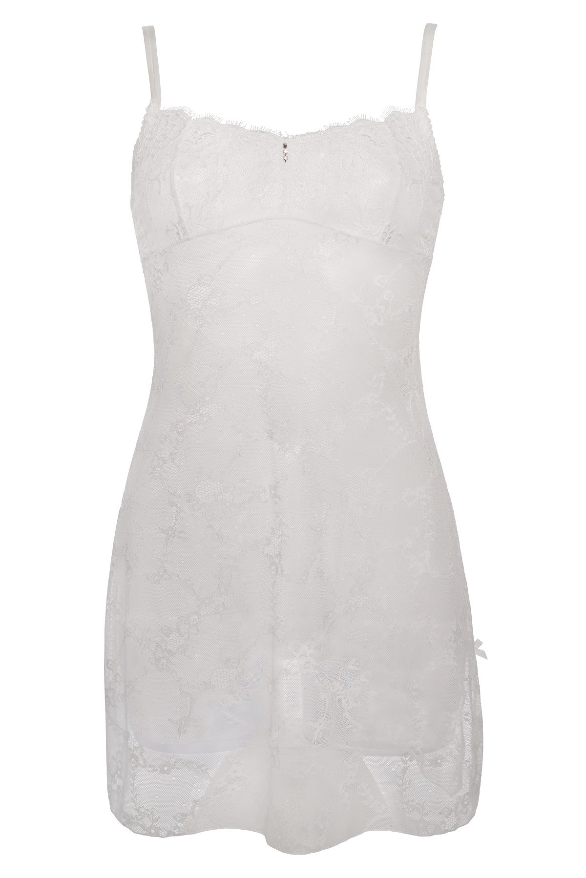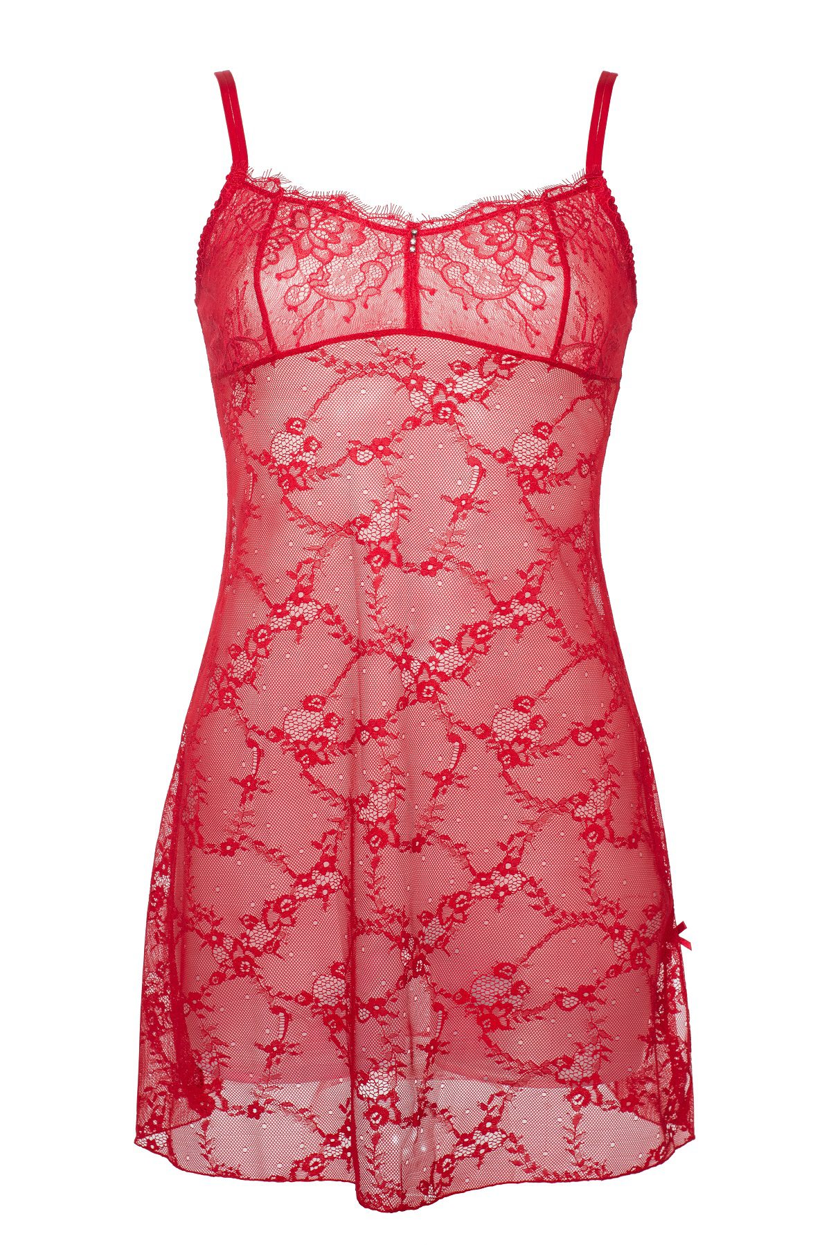 Une nuisette tout en dentelle “EYELASH”. Des bonnets à la taille pour un meilleur bien-aller. Petites fentes sur les côtés. Trois strass au décolleté.